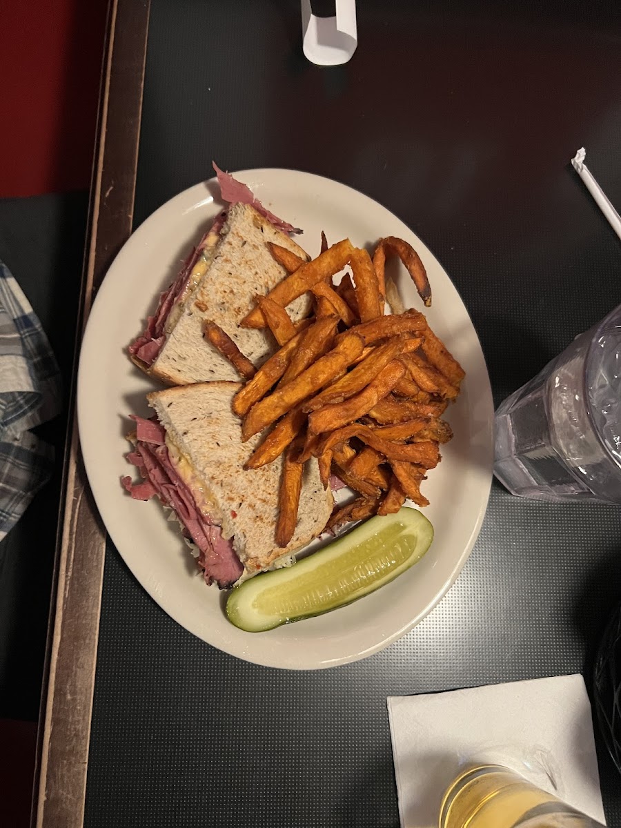 I ordered the corned beef sandwich with french fries and a pickle spear. I received a thick stack of corned beef which was nice. The corned beef had more fat in it than I like. The french fries were not cooked enough. I could tell by the color then confirmed when I bit into them. The french fries did not have the crunchy texture although they were seasoned well. I received great service at the bar. The restaurant has a fun vibe to it. They have a very large parking lot in front of the restaurant.